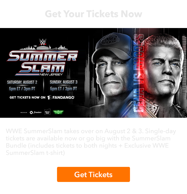 *WWE SummerSlam Bundle is non-refundable. Limited time offer. While supplies last. Domestic shipping will be added at checkout. Movie tickets are non-refundable and non-exchangeable. Fandango reserves the right to modify or cancel this offer at any time and without notice. You must be 18 years of age or older to purchase a bundle. T-shirt will begin shipping in August. Please use a physical U.S. address where the shipment can be delivered. Once carrier confirms delivery, Fandango is not responsible for lost or stolen deliveries. See full terms and conditions at https://redeem.fandango.com/products/wwe-summerslam-bundle.
